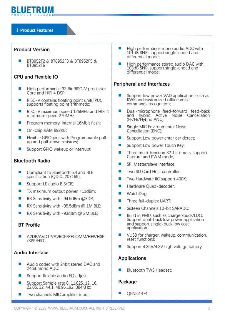 中科藍訊BT8952F內置32位高性能RISC-V處理器核心和HIFI 4 DSP,處理器最大速度125MHz,HIFI 4最大速度270Mhz;內置16Mbits閃存,892KB RAM,具有可編程上拉和下拉電阻的靈活GPIO引腳;支持GPIO喚醒或中斷。