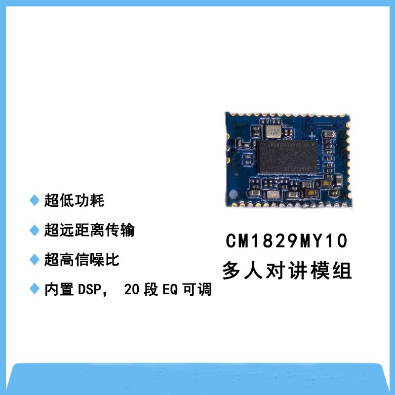 - CM1829MY10為本公司自主開發(fā)的多人組網(wǎng)等多功能一體的藍(lán)牙模塊,基于BES2700YP高端芯片設(shè)計(jì),旨在為終端客戶提供低成本、高效率的4人、6人、8人、10人無線組網(wǎng)解決方案。BES2700YP芯片為模塊提供了高品質(zhì)的音質(zhì)和兼容性,整體性能更優(yōu)化。客戶只需要把模塊接入應(yīng)用產(chǎn)品,可以迅速地實(shí)現(xiàn)組網(wǎng)對(duì)講。