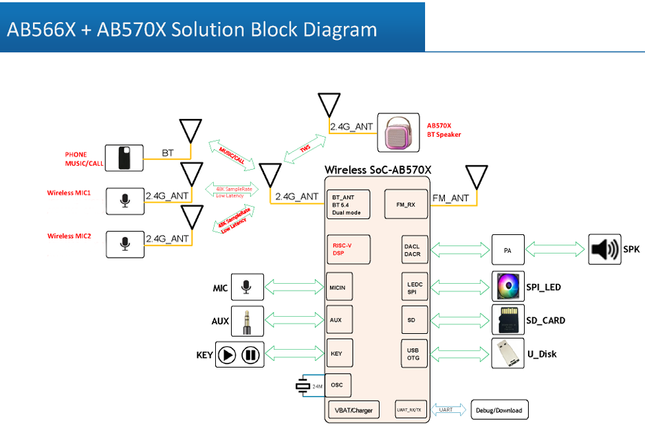 一、單芯片全功能(2x無(wú)線MIC+手機(jī)藍(lán)牙+FMRX+TWS+DSP)